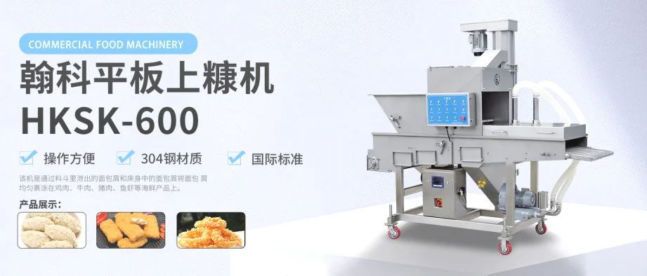 该机是通过料斗里泄出的面包屑和床身中的面包糠将面包糠均匀裹涂在鸡肉、牛肉、猪肉、鱼虾等海鲜产品上;