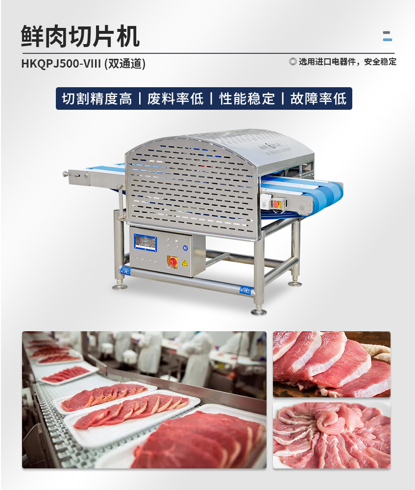 鲜肉切片机采用304不锈钢及食品级塑料制成,符合HACCP要求,一次性多层切片,最薄2.5mm ,厚度可调。可适用于猪肉,牛肉,羊肉,猪里脊,猪五花肉,鸡肉,鸡胸肉,鸭胸肉等产品进行切割。