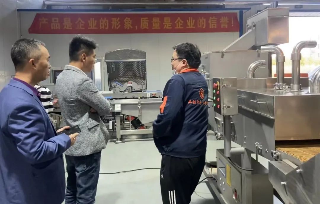 - The customer's new plant in Bengbu, Anhui Province is about to be put into operation. Led the person in charge of the company to inspect the ribbon fish coating powder and drenching equipment, and conducted a trial machine test on the site, have a more professional understanding of the process flow of ribbon fish. Manager Li explained the equipment scheme and product performance for customers.