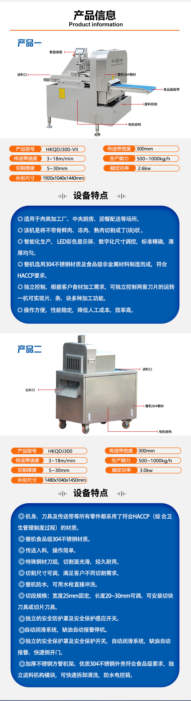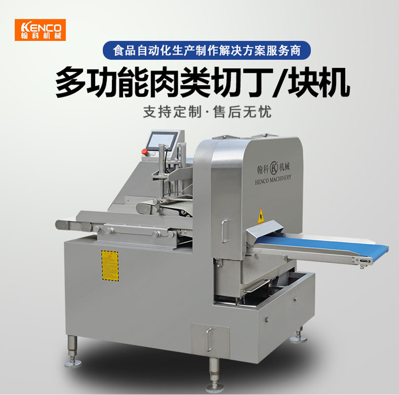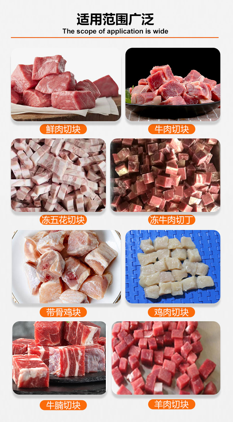 鸡肉切块机器可适用于鸡肉、鸡胸肉,鸭肉,鸭胸肉,猪肉,鸡排,卡兹脆,猪里脊,牛肉,羊肉等鲜、冻肉等进行切割,性能稳定,操作方便。