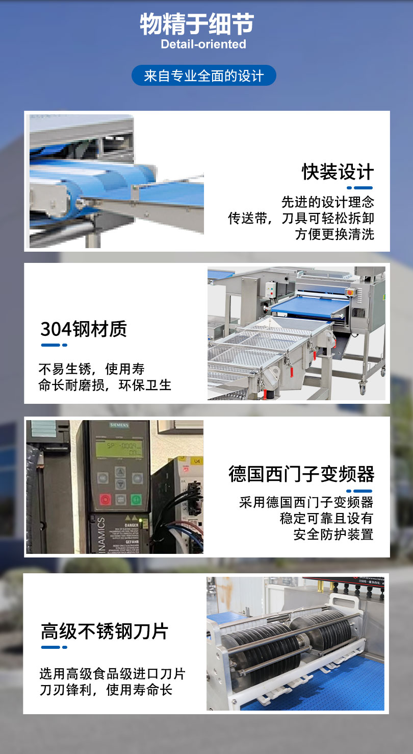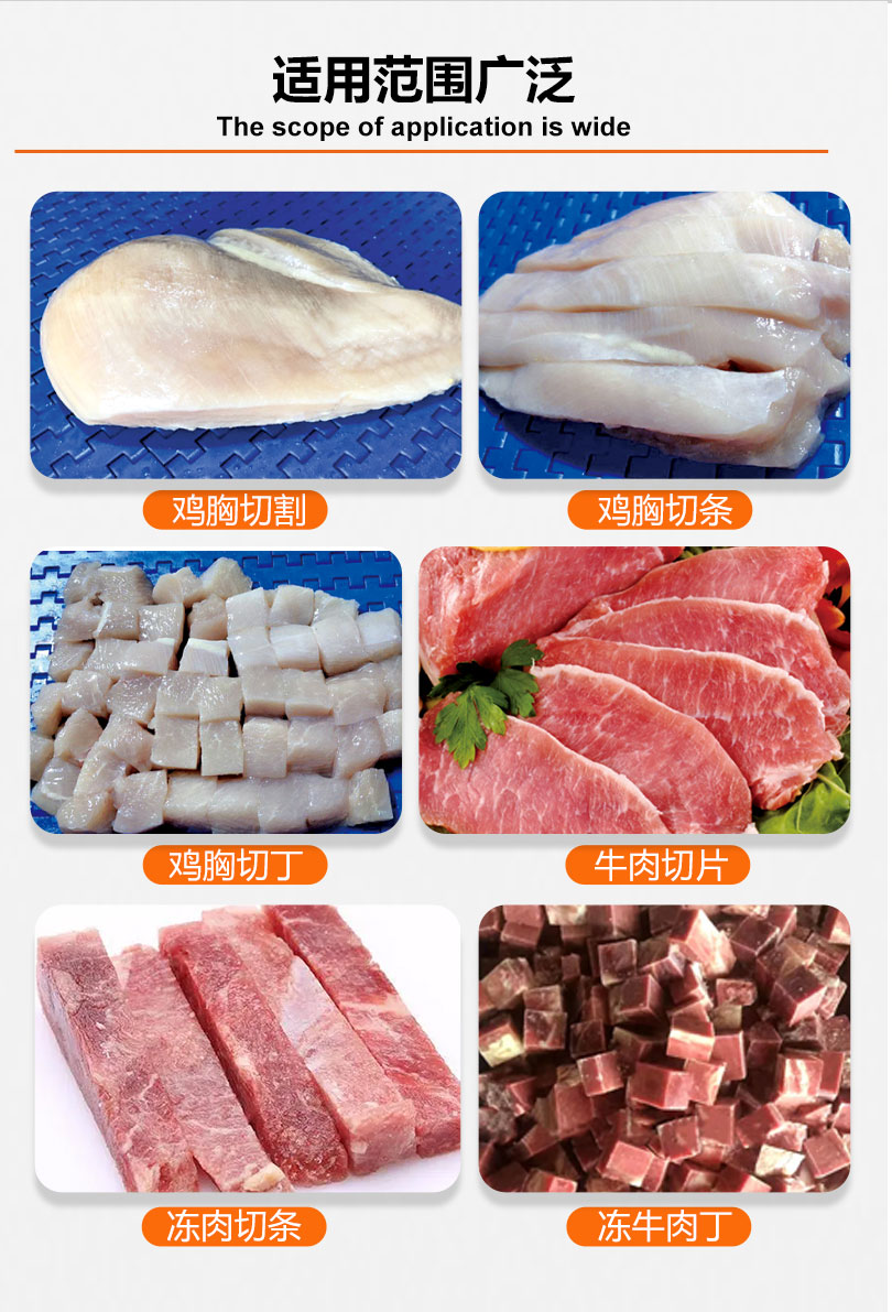 鲜肉切割生产线可实现片状、条状、丁状的均匀切割,可适用于禽肉、畜肉等新鲜肉类的均匀切割。人工费用少,产量大,出成率高,产品品质更高。