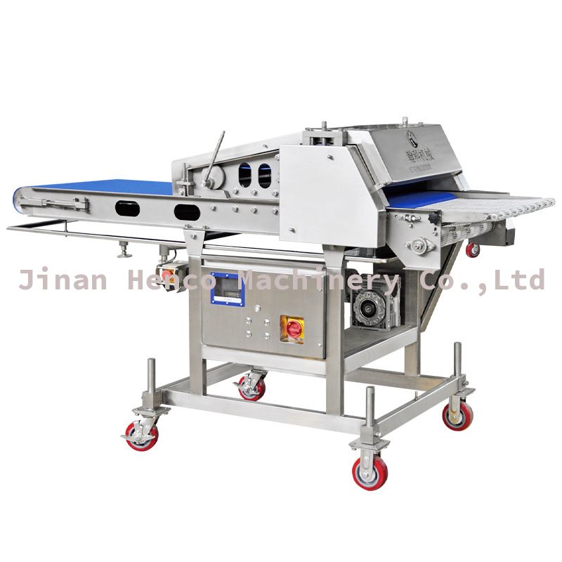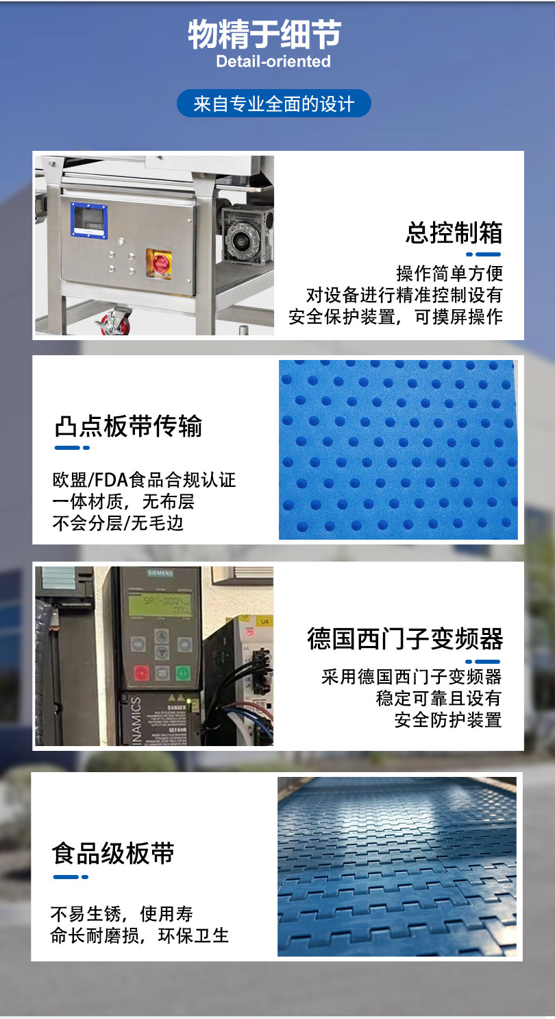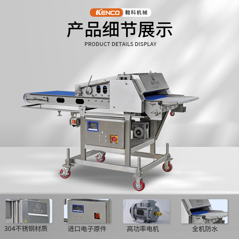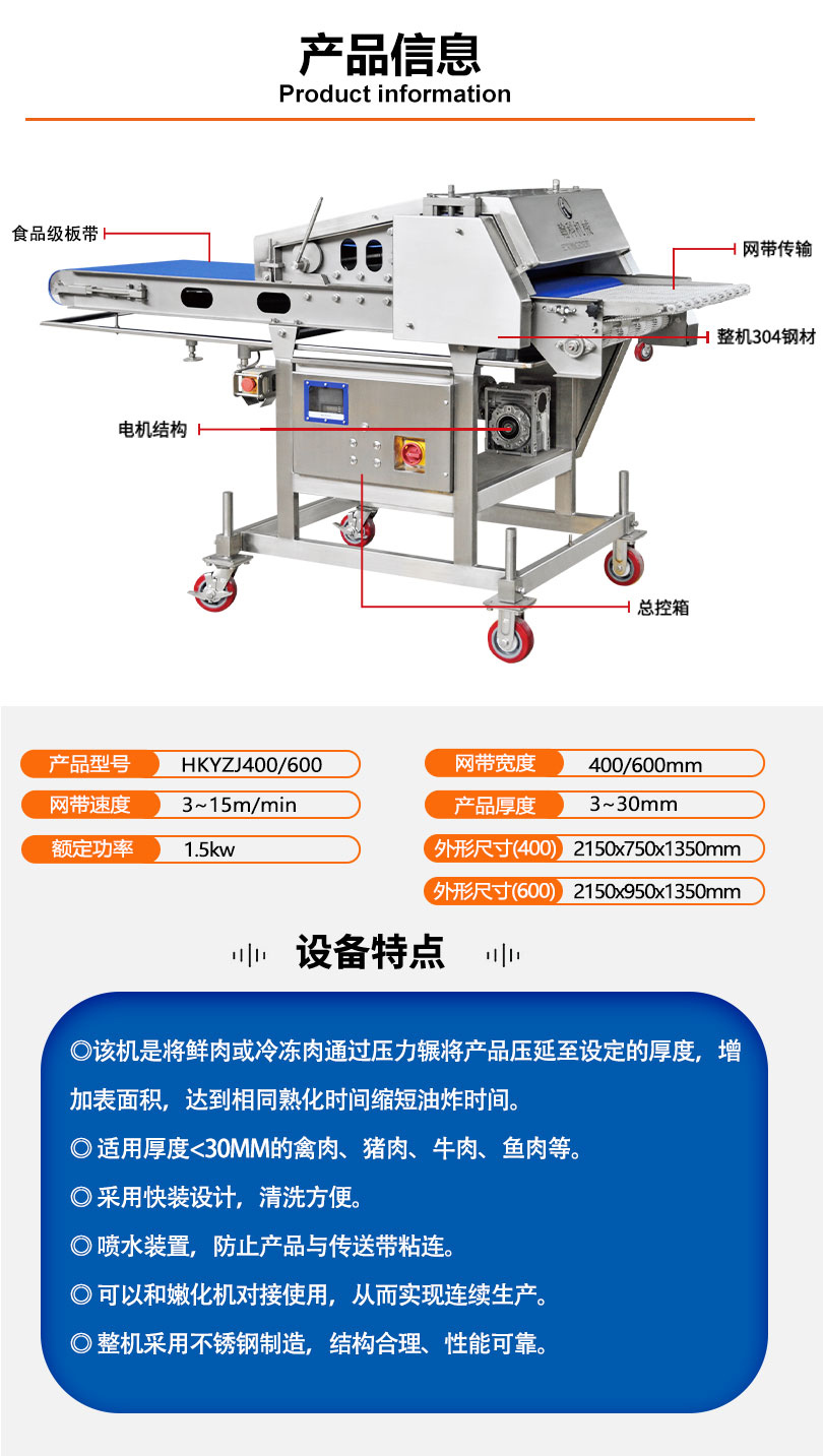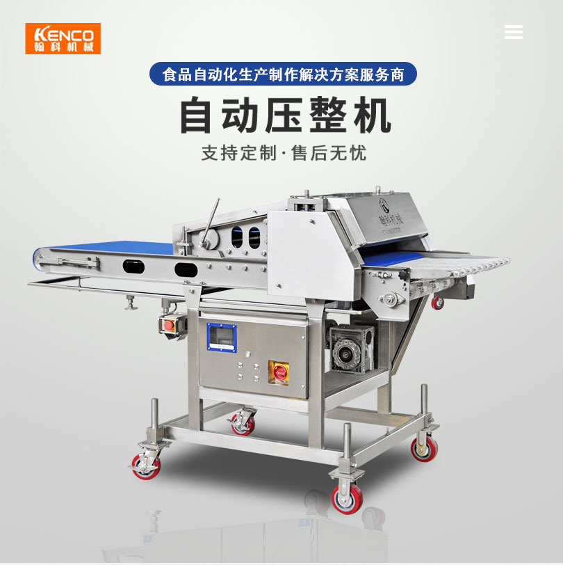 自动压整机是将鲜肉或冷冻肉通过压力锟将产品压延至设定的厚度,具有可靠的安全防护装置,有喷水装置,防止产品与传送带粘连,为食品加工行业提供了卓越的“生产力”。