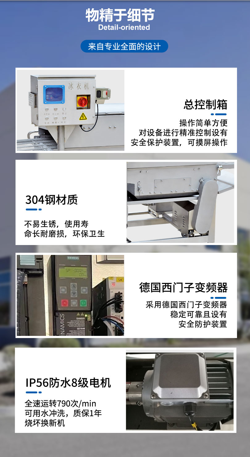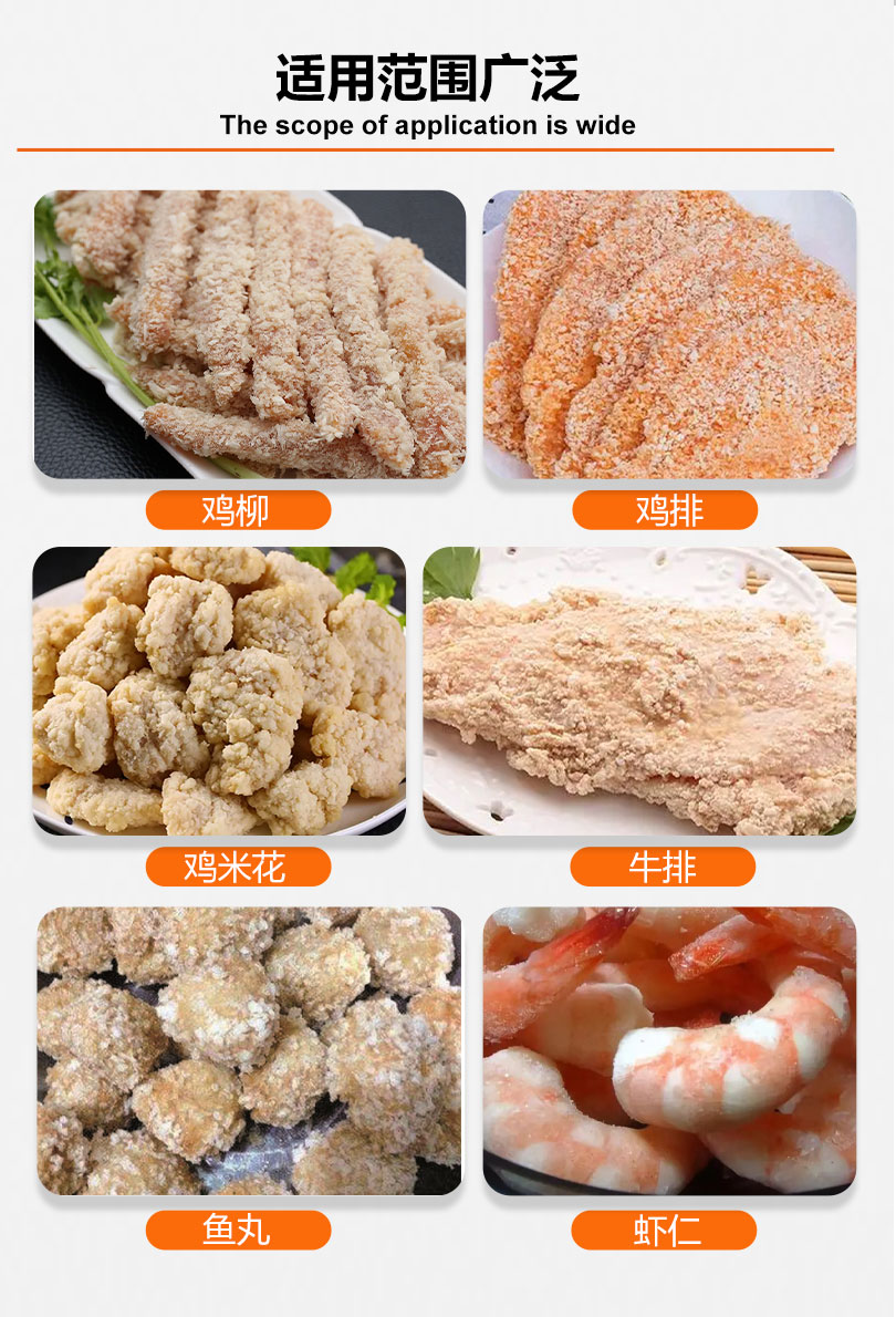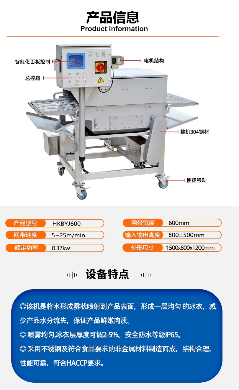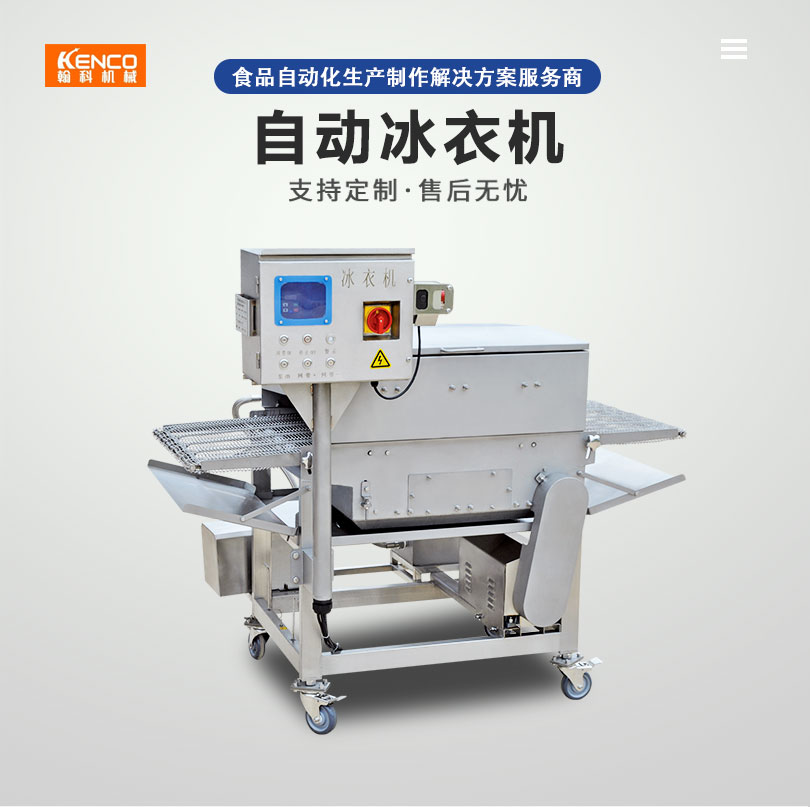 冰衣机可适用于鸡米花,上校鸡块,鸡排,雪花鸡柳,鸡胸肉等食品进行表面形成均匀的冰衣,减少水分流失。