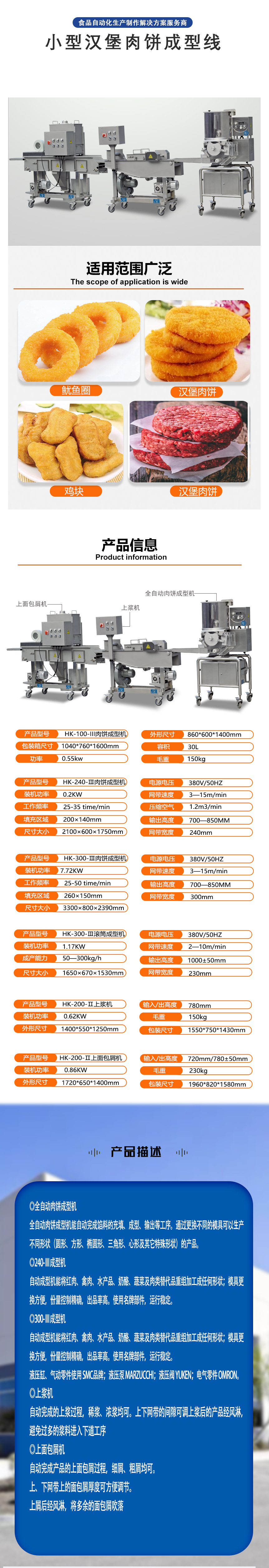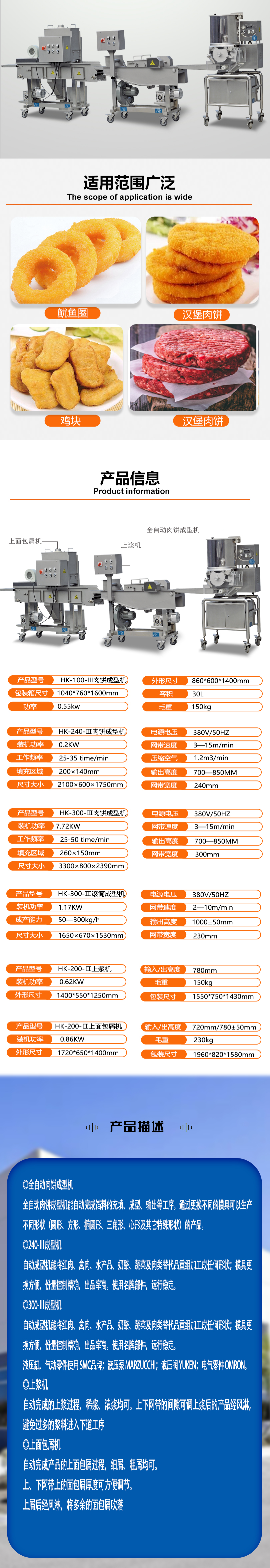 成型机:全自动肉饼成型机能自动完成馅料的充填、成型、输出等工序。通过更换不同的模具可以生产不同形状(圆形、方形、椭圆形、三角形、心形及其它特殊形状)的产品。