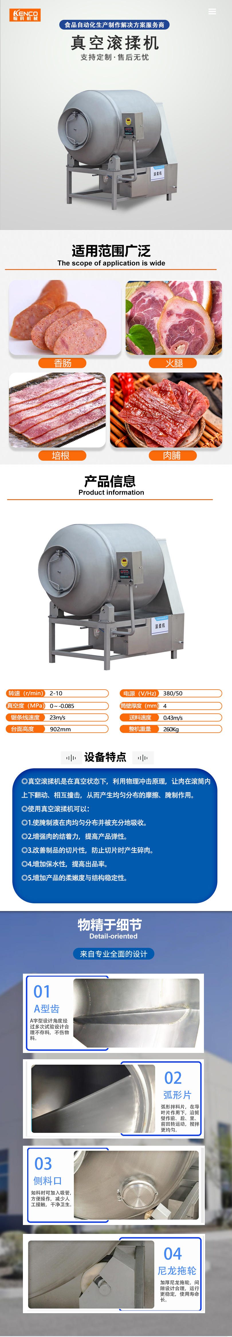 真空滚揉机是在真空状态下,利用物理冲击原理,让肉在滚筒内上下翻动、相互撞击,从而产生均匀分布的摩擦、腌制作用。