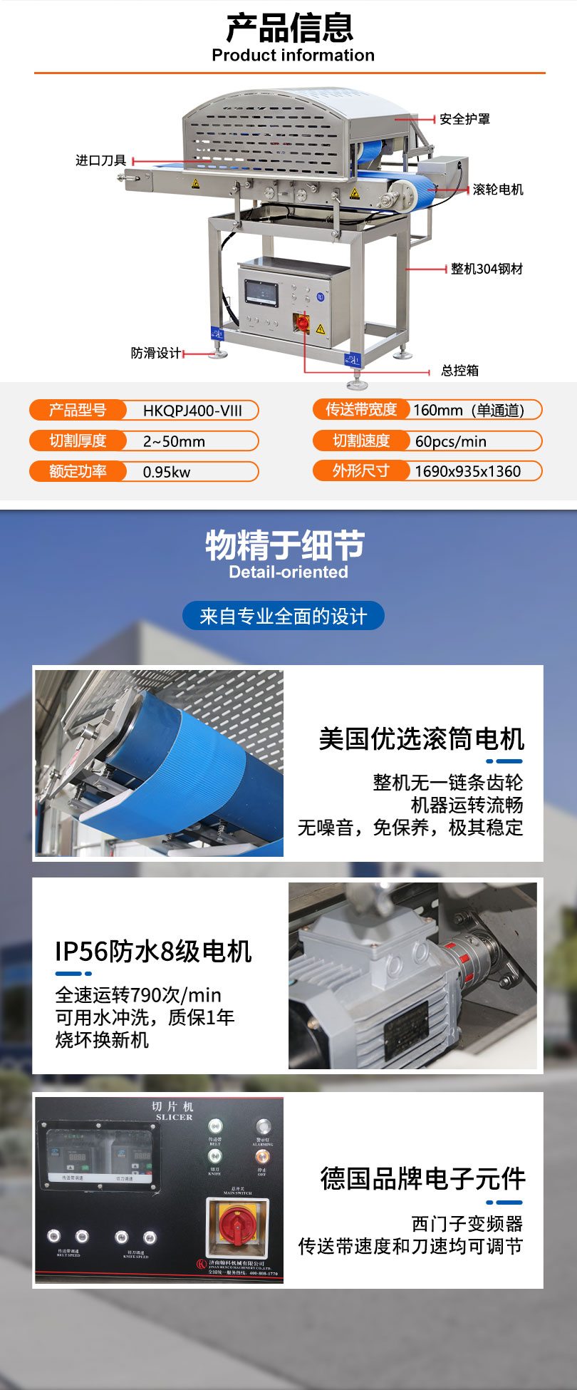 适用范围:适合切无骨肉类和其它类似榨菜带有弹性的食物,把原材料鲜肉或微冻肉切成肉片。全自动切肉。全自动送肉、切肉,速度快,不伤手,产量高,省时省力。厚薄均匀。机器切割出来的肉片大小均匀,出品美观。