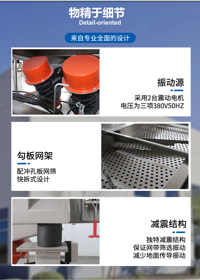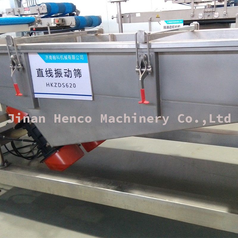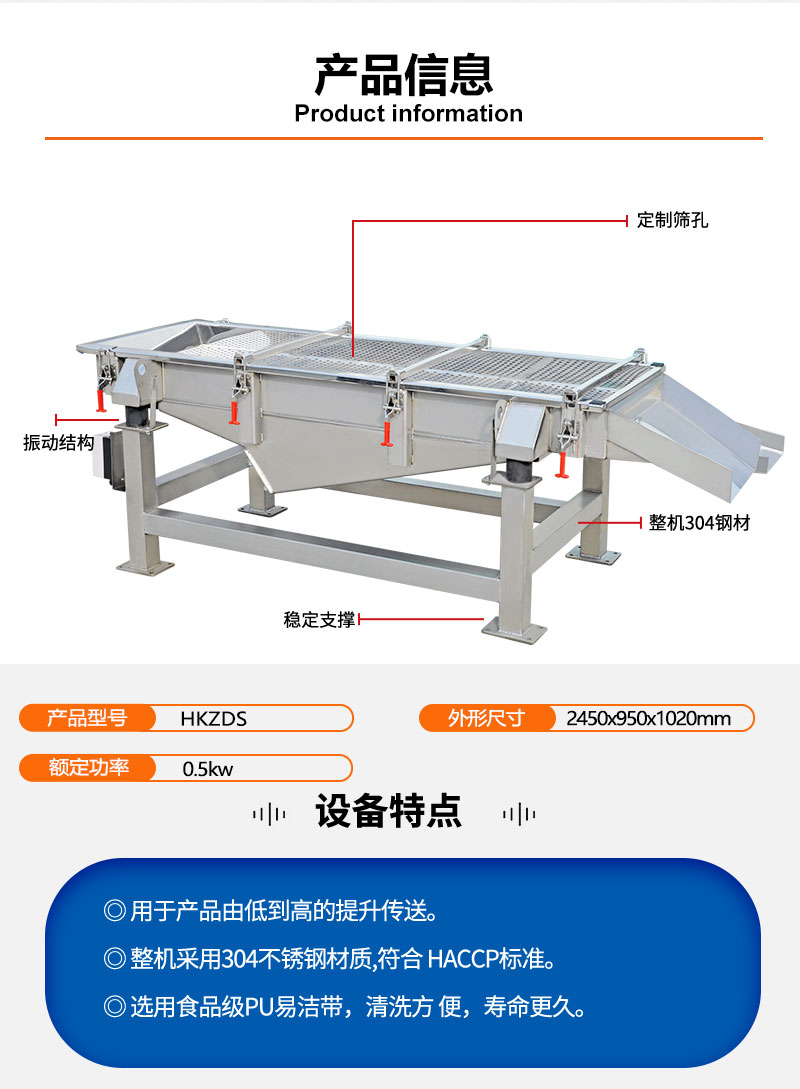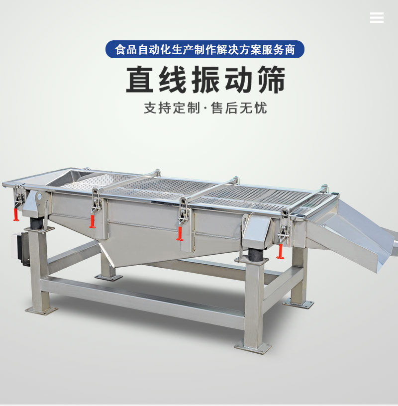 直线振动筛用于鲜肉和成品的筛分挑选,平稳支撑成品过渡。